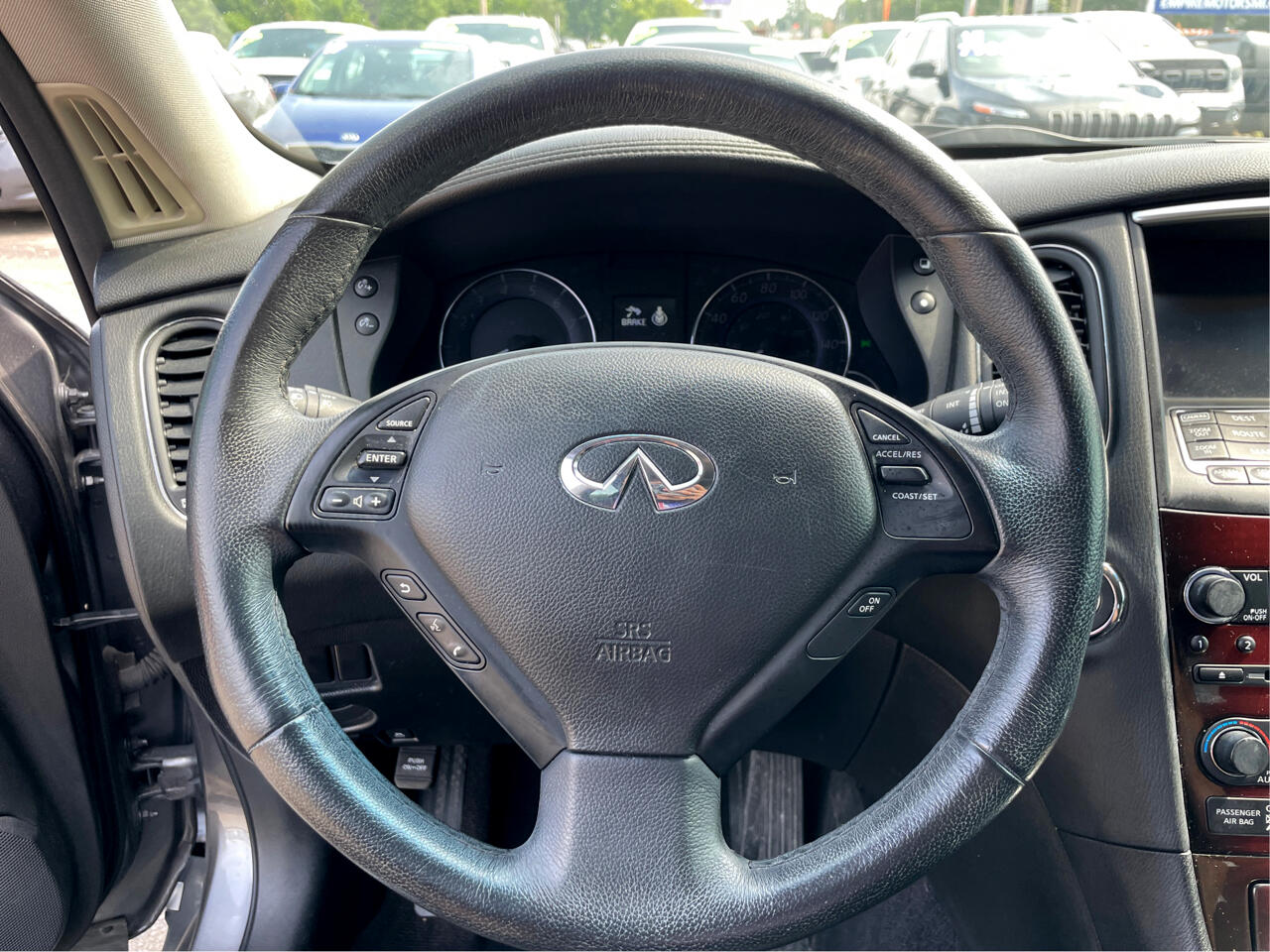 Get ready to cruise in style and comfort with this sleek Silver 2016 Infiniti QX50! This sporty SUV is packed with all the bells and whistles you could want in a vehicle - from the luxurious leather seats to the panoramic power sunroof, every drive will feel like a joyride. With its alloy wheels and rear spoiler, this car exudes a sense of sophistication and performance. Whether you're taking a road trip or just running errands, the adjustable foot pedals and telescopic steering column ensure that you'll find the perfect driving position for maximum comfort. And don't worry about safety - this Infiniti is equipped with top-notch features like ABS brakes, traction control, and a full complement of airbags to keep you and your passengers safe on the road. With keyless entry and a telematics system, this QX50 offers both convenience and connectivity at your fingertips. So hop in, buckle up, and get ready to enjoy the ride of your life in this feature-packed Infiniti QX50!Visit Empire Motors of Lansing online at empiremotorsmi.com to see more pictures of this vehicle or call us at 517-816-1500 today to schedule your test drive.